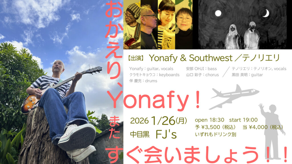 対バンは久々に東京に戻ってこられるヨナフィさんバンド、こちらも楽しみです!